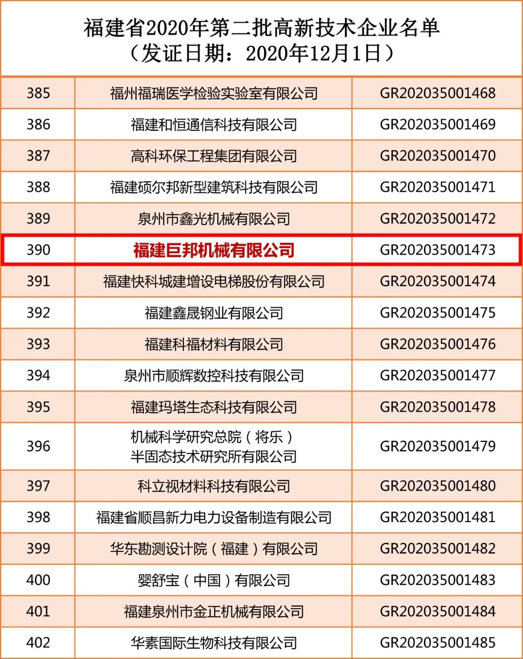 | 巨邦機(jī)械上榜福建省2020年第二批高新技術(shù)企業(yè)名單 |